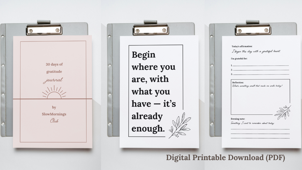 30 Days of Gratitude by Slow Mornings Club is a gentle daily journal designed to help you slow down, reconnect, and cultivate appreciation - one day at a time.